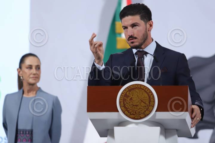 CIUDAD DE MÉXICO, 27NOVIEMBRE2025.+ Samuel García, gobernador de Nuevo León, presenta durante la conferencia del pueblo, las actividades y obras que realizará en la entidad que gobierna para recibir a la Copa del Mundo el siguiente año. FOTO: DANIEL AUGUSTO/ CUARTOSCURO.COM