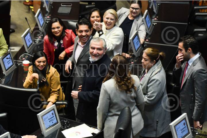CIUDAD DE MÉXICO, 27NOVIEMBRE2025.- Adán Augusto López, senador y coordinador de Morena junto a sus compañeros de bancada, durante la sesión ordinaria del Senado de la República en la que los grupos parlamentarios presentaron iniciativas de ley. La mesa directiva, decretó un receso luego de que presuntamente se planteará la discusión sobre la continuidad de Gertz Manero al frente de la Fiscalía General de la República (FGR). FOTO: MARIO JASSO/CUARTOSCURO.COM
