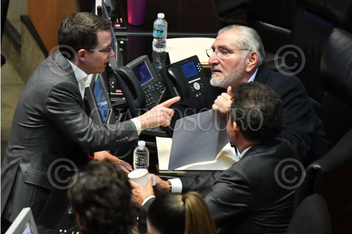CIUDAD DE MÉXICO, 27NOVIEMBRE2025.- Ricardo Anaya, senador y coordinador del PAN, y Adán Augusto López, senador y coordinador de Morena, durante la sesión ordinaria del Senado de la República en la que los grupos parlamentarios presentaron iniciativas de ley. La mesa directiva, decretó un receso luego de que presuntamente se planteará la discusión sobre la continuidad de Gertz Manero al frente de la Fiscalía General de la República (FGR). FOTO: MARIO JASSO/CUARTOSCURO.COM