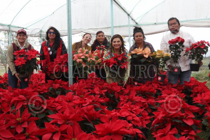 CIUDAD DE MÉXICO, 27NOVIEMBRE2025.- ; Julia Álvarez Icaza, secretaria de Medio Ambiente en la Ciudad de México, recibió una maceta de nochebuena con sello de certificación por parte de Clara Brugada, jefa de Gobierno, durante el arranque de Temporada de Nochebuenas 2025 en la alcaldía Xochimilco. FOTO: GRACIELA LÓPEZ/CUARTOSCURO.COM