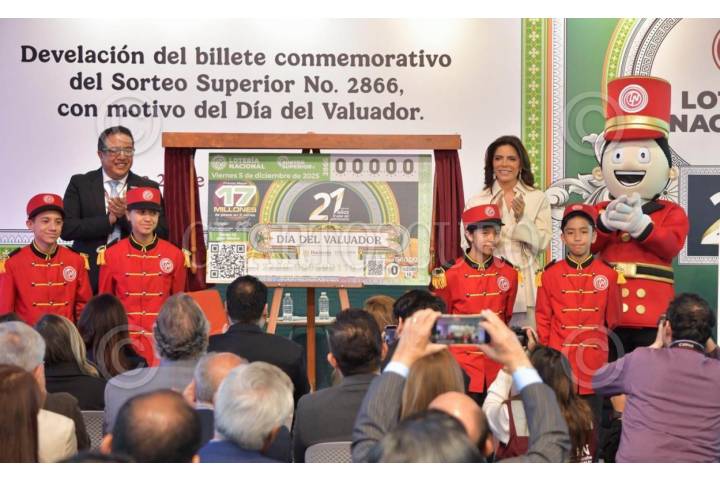 CIUDAD DE MÉXICO, 27NOVIEMBRE2025.- Olivia Salomón, directora de la Lotería Nacional, y Pablo Israel Escalona Almeraya, presidente del Instituto de Administración y Avalúos de Bienes Nacionales (INDAABIN) develaron el billete conmemorativo del Sorteo Superior No. 2866 que celebra el Día de las y los Valuadores, con el objetivo de difundir el trabajo que se implementa en una de las áreas más estratégicas del instituto, en su tarea de organizar el patrimonio inmobiliario federal y paraestatal, y potenciar su aprovechamiento, por ello, la distinción enmarca un reconocimiento a los profesionales encargados de determinar el valor de los bienes y propiedades, quienes contribuyen al uso eficiente del patrimonio de las y los mexicanos. FOTO: CORTESÍA LOREÍA NACIONAL/CUARTOSCURO.COM