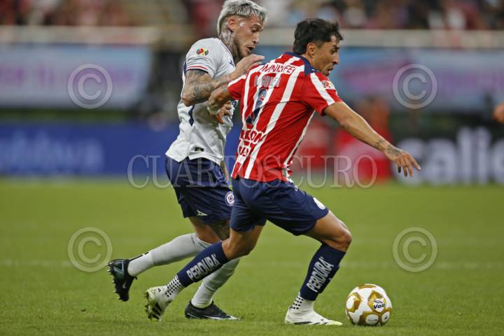 ZAPOPAN, JALISCO, 27NOVIEMBRE2025.- Carlos Rodríguez jugador de Cruz Azul disputa el balón con el contrario de Chivas, Omar Govea, esto en partido correspondiente a los Cuartos de Final del Torneo Apertura 2025 de la Liga MX, en donde se enfrentan los equipos de Chivas vs Cruz Azul y en juego que se lleva a cabo en el Estadio Akron, el marcador al momento es de 0-0. FOTO: FERNANDO CARRANZA GARCIA / CUARTOSCURO.COM