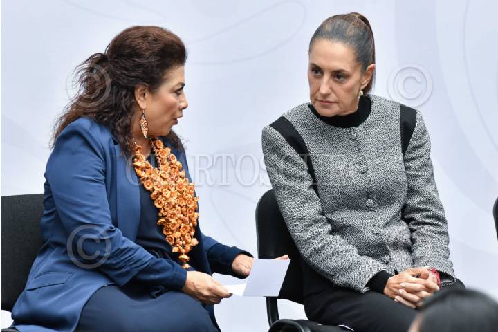 CIUDAD DE MÉXICO, 28NOVIEMBRE2025.- Clara Brugada, jefa de Gobierno, y Claudia Sheinbaum, presidenta de México, durante la ceremonia del Premio Nacional de Deportes 2025, realizado en el patio Central de Palacio Nacional. FOTO: MARIO JASSO/CUARTOSCURO.COM