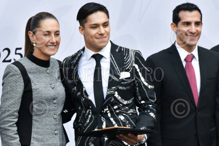 CIUDAD DE MÉXICO, 28NOVIEMBRE2025.- Claudia Sheinbaum, presidenta de México, presidió la ceremonia de entrega del Premio Nacional de Deportes 2025, realizada en el patio Central de Palacio Nacional. Los galardonados fueron: Andrea Maya Becerra Arizaga (Tiro con arco); Alegna Aryday González Muñoz (Atletismo); Uziel Aarón Muñoz Galarza (Atletismo); Osmar Olvera Ibarra (Clavados); Isaac Del Toro Romero (Ciclismo); Luis Carlos López Valenzuela (ParaAtletismo); Osiris Aneth Machado Plata (ParaAtletismo); Alejandro Laberdesque Vázquez (Atletismo); Karen Selene Montellano Ruvalcaba (Tiro con Arco); Araceli Ornelas Caballero (Taekwondo); Leslie Selene Velasco González (ParaPowerlifting); Gabriela Belem Agúndez García (Clavados); Donovan Daniel Carrillo Suazo (Patinaje sobre hielo); José Arnulfo Castorena Vélez (ParaNatación); Maria Lorena Ramirez Nahueachi (Atletismo Ultramaratones); Mirna Beatriz De la Cruz Álvarez (Fomento al deporte), y Ma Jin (Trayectoria). FOTO: MARIO JASSO/CUARTOSCURO.COM