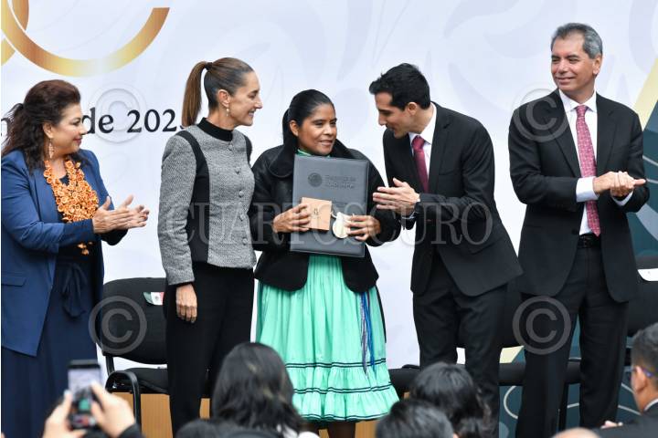 CIUDAD DE MÉXICO, 28NOVIEMBRE2025.- Maria Lorena Ramirez Nahueachi, recibió de manos de Claudia Sheimbaum, presidenta de México, el Premio Nacional de Deportes 2025 en la disciplina Atletismo Ultramaratones, durante la ceremonia realizada en el patio Central de Palacio Nacional. Los acompañan: Clara Brugada, jefa de Gobierno; Rommel Pacheco, director de la CONADE y Édgar Amador Zamora, secretario de Hacienda y Crédito Público. FOTO: MARIO JASSO/CUARTOSCURO.COM