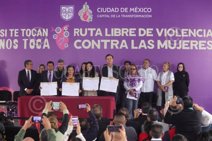 CIUDAD DE MÉXICO, 28NOVIEMBRE2025.- La jefa de Gobierno Clara Brugada Molina firma como testigo de honor los convenios con representantes de transporte público consecionado durante la presentación del programa "Ruta libre de violencia contra las mujeres", que pretende abatir la violencia contra las mujeres en el transporte público; el evento de llevó a cabo en el Cetram de Chapultepec. FOTO: EDGAR NEGRETE LIRA/CUARTOSCURO.COM