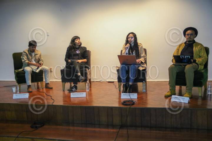 CIUDAD DE MÉXICO. 28NOVIEMBEE2025.- Hugo Arreola, Brenda Nava, Sandra Suaste y Sergio Marcos Ik, en el conversatorio por la liberación de Kenia, abogada y activista afro mexicana detenida por bloquear una carretera. FOTO: VICTORIA VALTIERRA/CUARTOSCURO.COM
