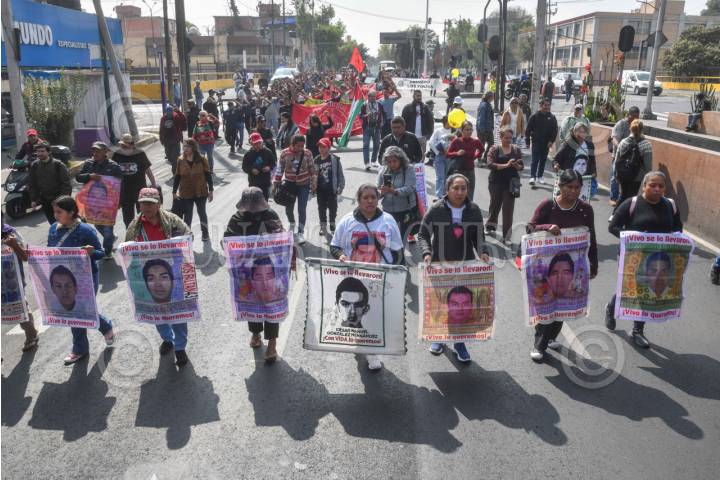 CIUDAD DE MÉXICO, 26DICIEMBRE2025.- Madres y padres de los 43 normalistas desaparecidos de Ayotzinapa, junto a estudiantes, realizaron una marcha que partió de la glorieta de Peralvillo rumbo a la Basílica de Guadalupe como parte de la actividades de la "135 Acción global por Ayotzinapa" en conmemoración del décimo aniversario de los hechos en Iguala. FOTO: MARIO JASSO/CUARTOSCURO.COM