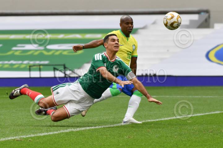 CIUDAD DE MÉXICO, 19ABRIL2026.- Rafael Márquez (México) y Edilson (Brasil), durante el "partido de leyendas" entre México y Brasil celebrado está tarde en el Estadio Banorte. Marcador final: Leyendas México (3) - (2) Leyendas Brasil. FOTO: MARIO JASSO/CUARTOSCURO.COM