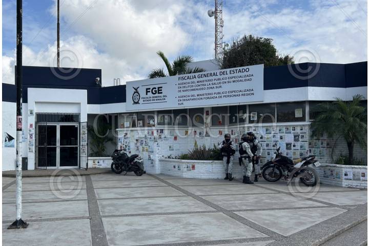 MAZATLAN, SINALOA, 09FEBRERO2026.- Instalaciones de la Fiscalía General del Estado Zona Sur, mantiene un fuerte resguardo de seguridad. El día de hoy han sido entregados los cuerpos de los mineros identificados después de ser localizados en una fosa clandestina en la comunidad El Verde, municipio de Concordia. FOTO: DANIA ROBLES /CUARTOSCURO.COM