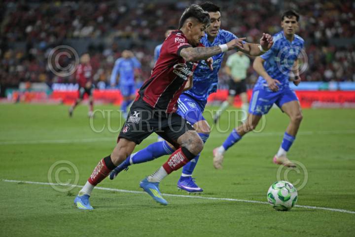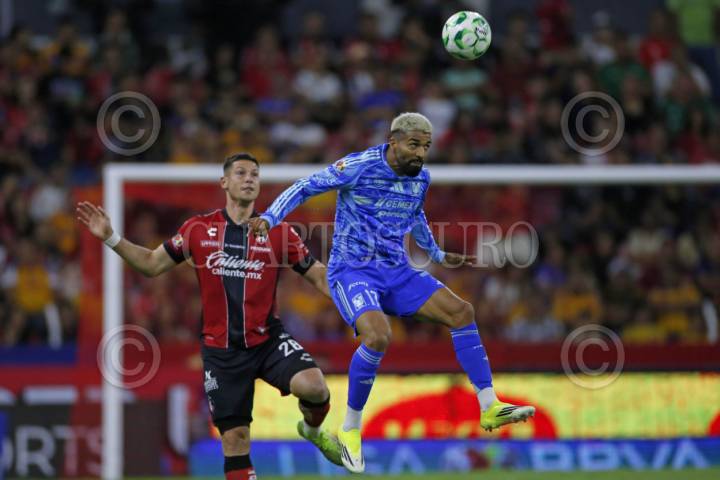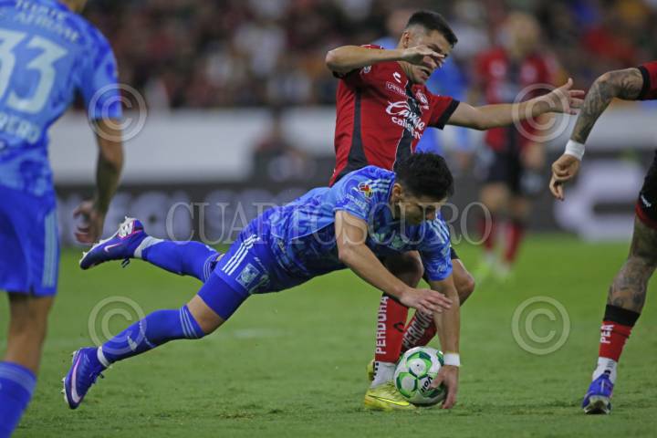 GUADALAJARA, JALISCO. 22ABRIL2026- Diego González jugador de Atlas, disputa un balón con el contrario de Tigres Jesús Angulo, esto en partido correspondiente a la jornada 16 del Torneo Clausura 2026 de la Liga MX, en donde se enfrentan los equipos de Atlas vs Tigres y en juego que se llevo a cabo en el Estadio Jalisco, el marcador al final es de 0-0. FOTO: FERNANDO CARRANZA GARCIA / CUARTOSCURO.COM