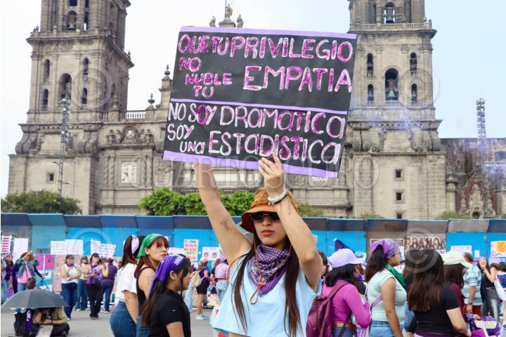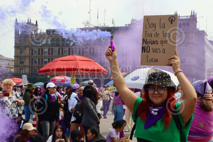 CIUDAD DE MÉXICO, 08MARZO2026.- Miles de mujeres salieron a las calles a manifestarse en conmemoración del día internacional de la mujer, y llegan a la plancha del zócalo del la CDMX FOTO: ADRIANA ALVAREZ/CUARTOSCURO.COM