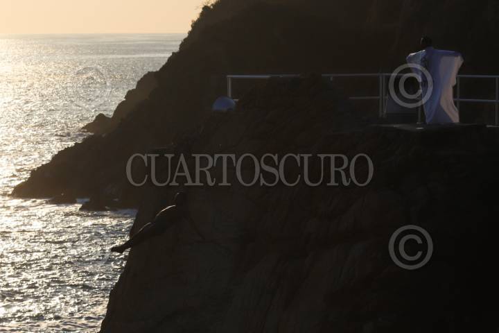 ACAPULCO, GUERRERO, 28ABRIL2026.- Dos clavadistas se arrojan desde la Quebrada, uno se envuelve con la bandera de FONATUR. FOTO: DANIEL AUGUSTO/ CUARTOSCURO.COM