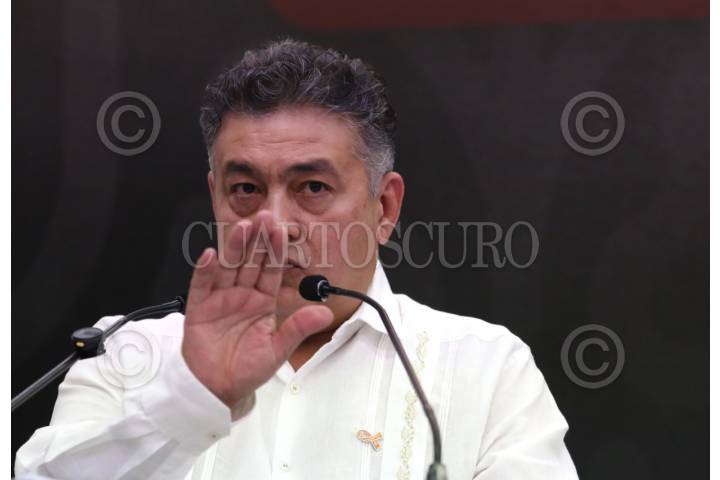 CUERNAVACA, MORELOS, 19NOVIEMBRE2025.- Conferencia de prensa quincenal del tema de seguridad publica en el Salón Bicentenario del Palacio de Gobierno. En la imagen, el titular de la Secretaria de Seguridad y Protección Ciudadana, Miguel Ángel Urrutia. quien informo del aseguramiento de una bodega almacenadora de drogas sintéticas en el municipio de Yautepec, asegurando 120 kilos de la droga conocida como cristal lista para su venta que se calcula en 35 millones de pesos. FOTO: MARGARITO PÉREZ RETANA/CUARTOSCURO.COM