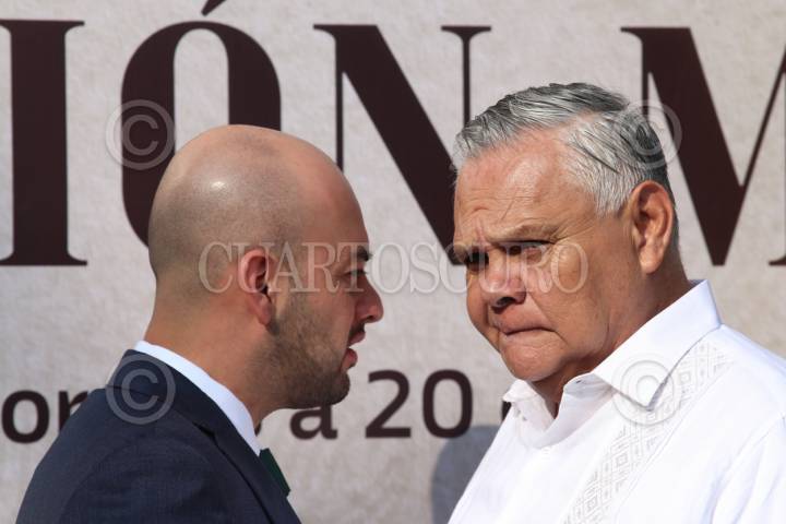 CUERNAVACA, MORELOS, 20NOVIEMBRE2025.- El secretario de Gobierno, Edgar Maldonado Ceballos platica con Javier García Chávez, jefe de la Oficina de la Gubernatura antes del evento por el 115 Aniversario del inicio de la Revolución Mexicana y la entrega del Premio Estatal del Deporte, realizado en la plaza armas. El evento fue encabezado por la gobernadora Margarita González Saravia acompañada de todo su gabinete y representantes de las fuerzas armadas. FOTO: MARGARITO PÉREZ RETANA/CUARTOSCURO.COM