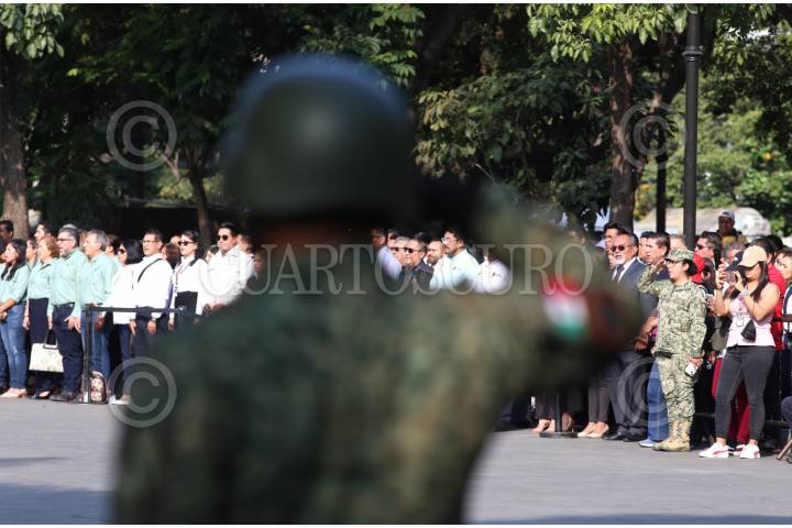 CUERNAVACA, MORELOS, 20NOVIEMBRE2025.- Un soldado del Ejercito saluda a la bandera durante el evento por el 115 Aniversario del inicio de la Revolución Mexicana y la entrega del Premio Estatal del Deporte, realizado en la plaza armas. El evento fue encabezado por la gobernadora Margarita González Saravia, acompañada de todo su gabinete y representantes de las fuerzas armadas. FOTO: MARGARITO PÉREZ RETANA/CUARTOSCURO.COM