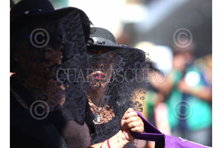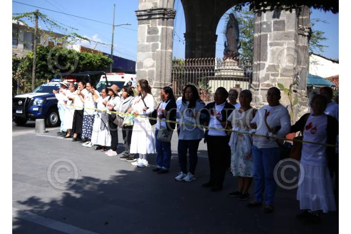 CUERNAVACA, MORELOS, 25NOVIEMBRE2025.- Un grupo de mujeres católicas hacen una valla al frente del chapitel del Calvario y la iglesia de San José al paso de la marcha del Colectivo Vida para Todas en el Dia Internacional de la Eliminación de la Violencia contra las Mujeres. FOTO: MARGARITO PÉREZ RETANA/CUARTOSCURO.COM