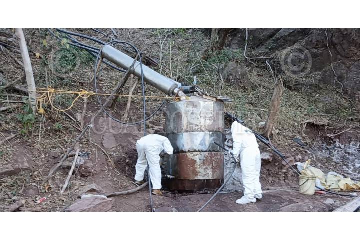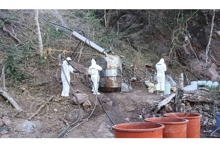 CARRICITOS, DURANGO, 08SEPTIEMBRE2025.- En operativo conjunto de la SEMAR, FGR, SEDENA, Guardia Nacional y la Secretaría de Seguridad y Protección Ciudadana (SSPC) localizaron y neutralizaron dos laboratorios clandestinos empleados para la elaboración de sustancias ilícitas, donde se aseguraron aproximadamente 21 toneladas de presunta metanfetamina. Esta acción se llevó a cabo durante recorridos de reconocimiento terrestre, cuando personal naval localizó y desmanteló dos laboratorios clandestinos. En el lugar se aseguraron aproximadamente 21,000 kilogramos de metanfetamina ya procesada, así como diversos precursores químicos, entre ellos: 1,000 litros de ácido clorhídrico. El material asegurado fue puesto a disposición del agente del Ministerio Público correspondiente. FOTO: CORTESÍA SEMAR/CUARTOSCURO.COM