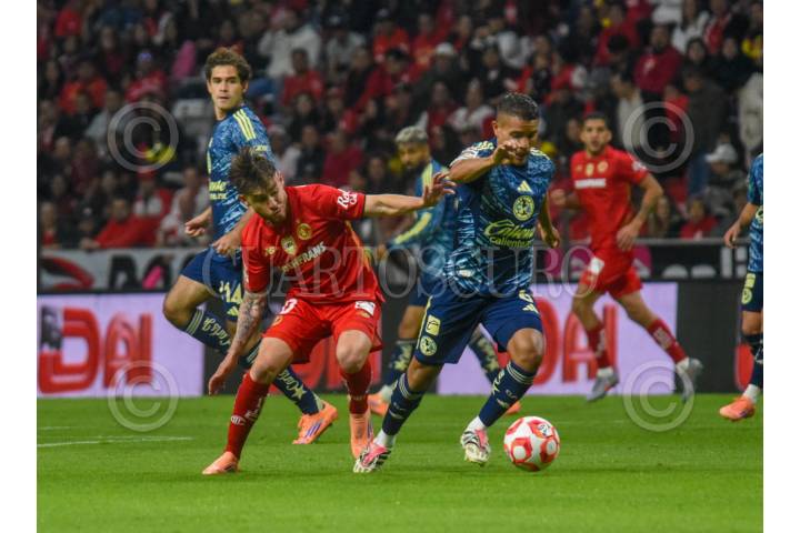 TOLUCA, ESTADO DE MÉXICO, 25MAYO2025. Erick Sánchez de las Águilas es marcado por Andrés Pereira de los Diablos durante el partido de fútbol Toluca vs América correspondiente a la final de vuelta del Torneo Clausura 2025 de Liga BBVA MX, en el Estadio Nemesio Díez. FOTO: EDGAR NEGRETE LIRA/CUARTOSCURO.COM