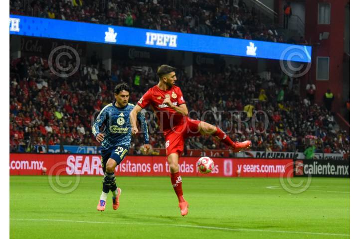 TOLUCA, ESTADO DE MÉXICO, 25MAYO2025. Andrés Pereira de los Diablos se adelanta a Alejandro Zendejas de las Águilas durante el partido de fútbol Toluca vs América correspondiente a la final de vuelta del Torneo Clausura 2025 de Liga BBVA MX, en el Estadio Nemesio Díez. FOTO: EDGAR NEGRETE LIRA/CUARTOSCURO.COM