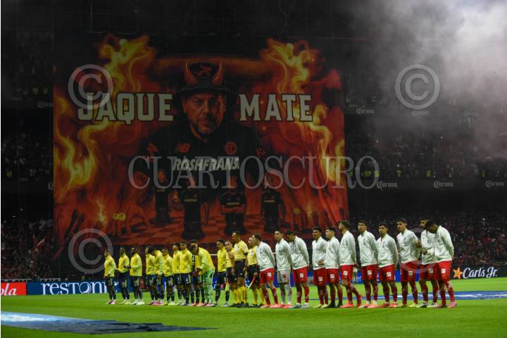 TOLUCA, ESTADO DE MÉXICO, 25MAYO2025. Los jugadores de Diablos y Águilas salen a la cancha previo al partido de fútbol Toluca vs América correspondiente a la final de vuelta del Torneo Clausura 2025 de Liga BBVA MX, en el Estadio Nemesio Díez. FOTO: EDGAR NEGRETE LIRA/CUARTOSCURO.COM