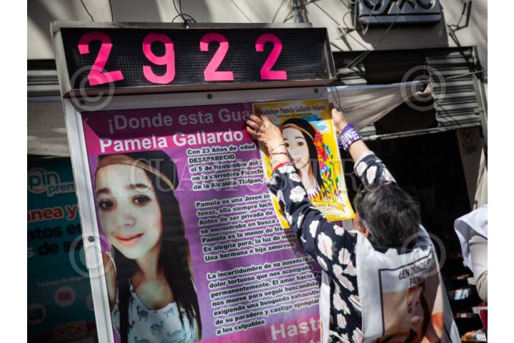 CIUDAD DE MÉXICO, 06NOVIEMBRE2025.- A 8 años de la desaparición de Pamela Gallardo, familiares y colectivas se citaron en el antimonumento “contador” de días frente a la fiscalía para denunciar la falta de protocolos para el seguimiento de su caso y otros de desapariciones en el Ajusco. FOTO: ANDREA MURCIA /CUARTOSCURO.COM