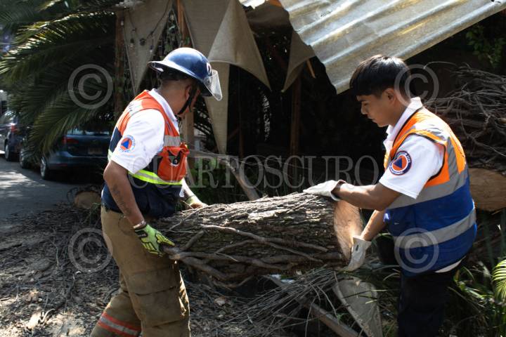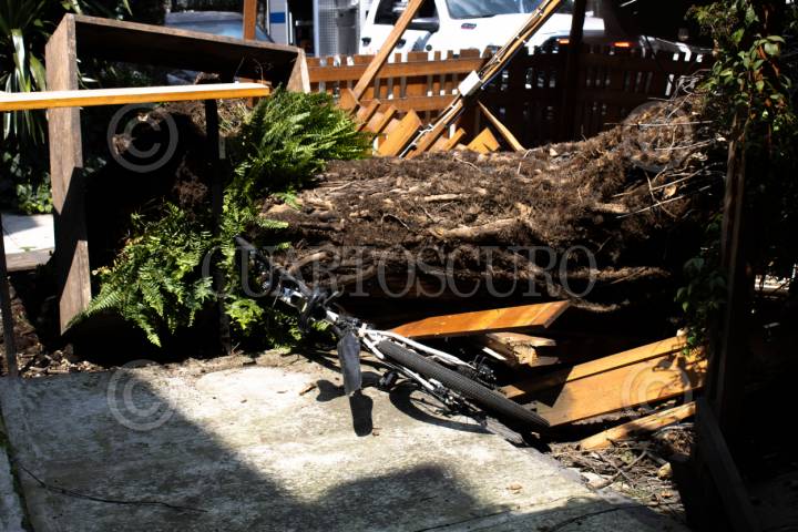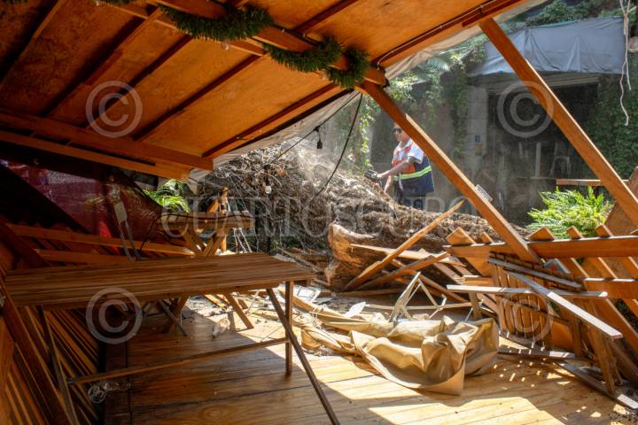 CIUDAD DE MÉXICO, 17OCTUBRE2025.- Esta mañana un árbol cayó sobre una terraza de madera a las afueras de un restaurante en la colonia Condesa. A pesar de que había comensales en el establecimiento, ninguno resultó lesionado. Elementos de Protección Civil acudieron para remover el árbol que causó daños en el local. El evento se registró en la calle Fernando Montes de Oca, casi esquina con Cuernavaca, alrededor de las 11:25 a.m. FOTO: CAMILA AYALA BENABIB /CUARTOSCURO.COM