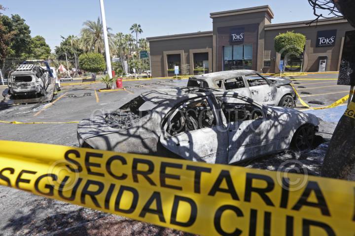 GUADALAJARA, JALISCO. 23FEBRERO2026.- Recorrido por diversas zonas de la ciudad, mismas que lucen desoladas por los hechos violentos que se suscitaron el día de ayer, tras el operativo donde autoridades castrenses abatieron al líder del CJNG Nemesio Oseguera Cervantes, puntos como en una plaza comercial ubicada en las avenidas de Normalistas y Circunvalación, realizan el levantamiento de algunos vehículos que fueron siniestrados. FOTO: FERNANDO CARRANZA GARCIA / CUARTOSCURO.COM