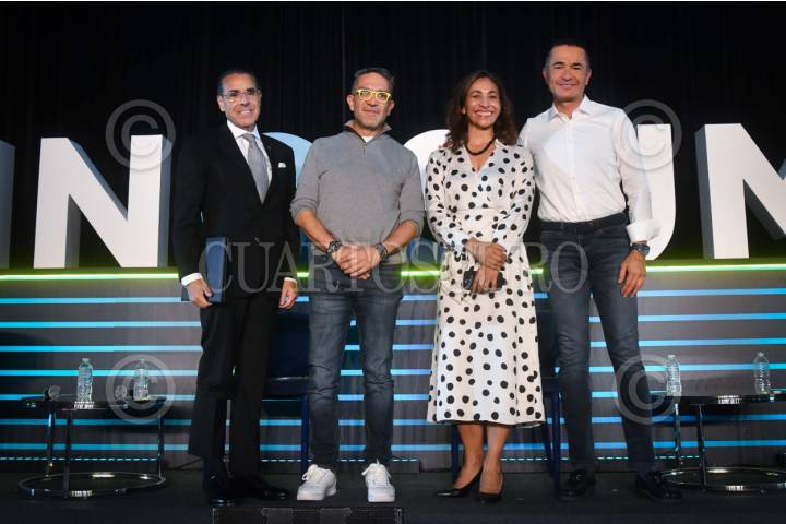 CIUDAD DE MÉXICO, 25SEPTIEMBRE2025.- Alejandro Valenzuela, presidente del Consejo de Banco Azteca; Salvador Espinosa, CEO de Prosa; Armando Herrera, CEO de Nu México y Myriam Cosío Robles, Chief External Affairs Officer de Clip, al finalizar el foro "Construyendo el nuevo ecosistema financiero. Banca Fintech y los nuevos actores transformado México" en el marco de las actividades del Finnosummit 2025 con sede en la Expo Santa Fe. FOTO: MARIO JASSO/CUARTOSCURO.COM