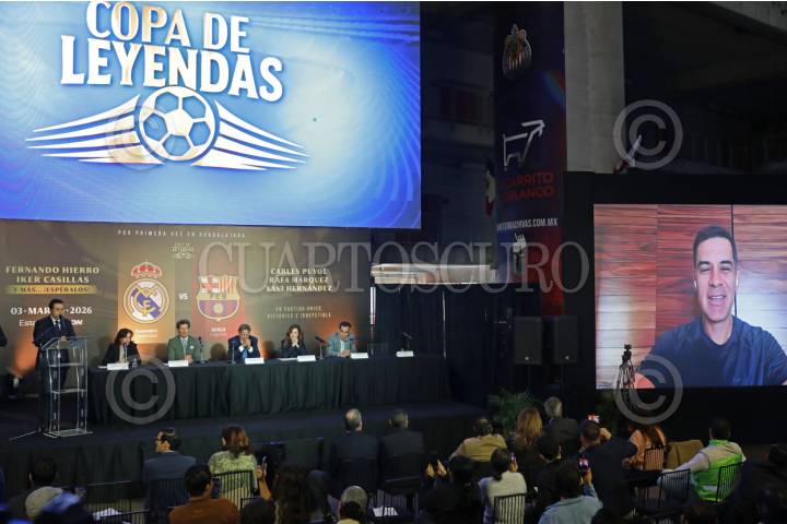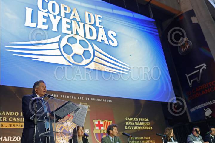 ZAPOPAN, JALISCO. 07ENERO2026.- Esta mañana, en las instalaciones del Estadio Akron, el presidente municipal de Zapopan, Juan José Frangie, durante una conferencia de prensa, hizo oficial el anuncio y dio a conocer los detalles de la Copa de Leyendas, en la que participan jugadores referentes e históricos de los equipos internacionales Real Madrid y Barcelona. En dicho evento participaron María Olímpica Cabral, directora comercial y de marketing del Club Deportivo Guadalajara; Francisco Alamán González, promotor de Ocesa; Juan José Frangie, presidente municipal de Zapopan; Verónica Delgadillo, presidenta municipal de Guadalajara; Carlos de la Torre, promotor de Ocesa Jalisco, y Marcelo Michel Leaño, enlace deportivo. FOTO: FERNANDO CARRANZA GARCÍA /CUARTOSCURO.COM