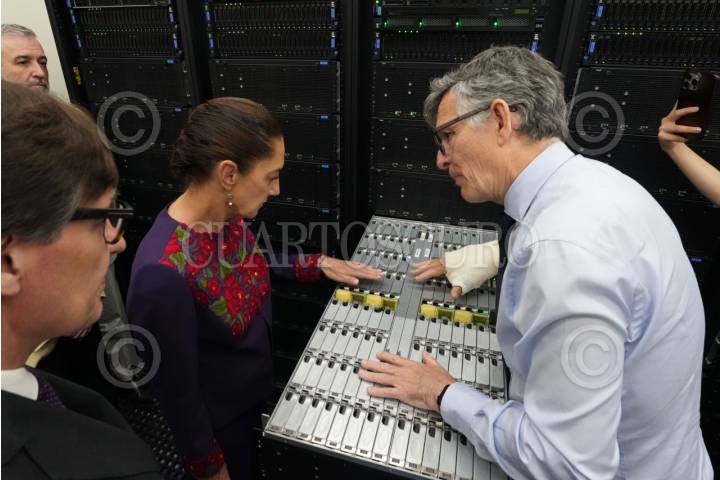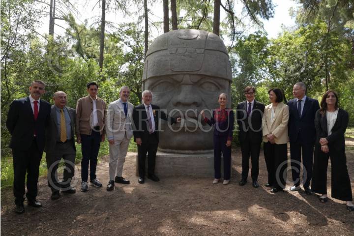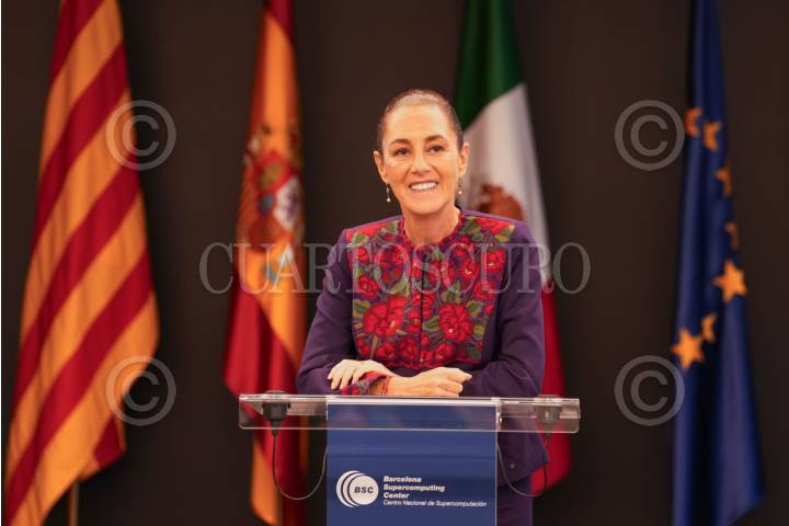 BARCELONA, ESPAÑA, 19ABRIL2026.- Claudia Sheinbaum, Presidenta de México, visitó el Centro Nacional de Supercomputación de Barcelona, que se ubica en la Universidad Politécnica de Cataluña, ahí destacó la colaboración de este centro de estudios para desarrollar el Proyecto Coatlicue, la supercomputadora mexicana. Como parte de estos esfuerzos la Universidad de Veracruz donó una cabeza Olmeca, que luce en los jardines de la UPC. FOTO: PRESIDENCIA/CUARTOSCURO.COM