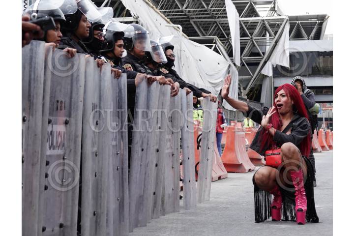 CIUDAD DE MÉXICO, 19ABRIL2026.- Durante el boicot a la inauguración de la ciclovía, trabajadoras sexuales del colectivo “Trasuix” gritaron consignas y se quejaron del cuerpo de granaderos que fue desplegado durante la protesta. FOTO: CAMILA AYALA BENABIB / CUARTOSCURO.COM