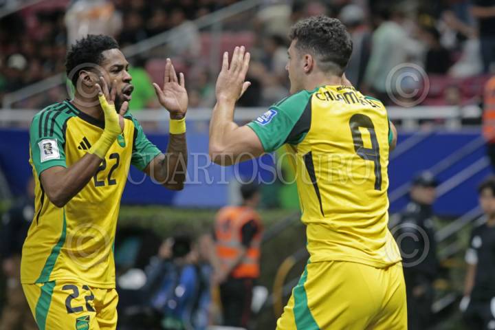 ZAPOPAN, JALISCO.. 26MARZO2025.- Bailey Cadamarteri jugador de Jamaica celebra su anotación, esto en juego correspondiente al repechaje intercontinental entre las selecciones de Jamaica frente a Nueva Caledonia, para aspirar a un boleto mundialista Canadá; México y Estados Unidos 2026, dicho compromiso se lleva a cabo en el Estadio Guadalajara, el marcador al momento es de 1-0 a favor del equipo de Jamaica. FOTO: FERNANDO CARRANZA GARCIA / CUARTOSCURO.COM