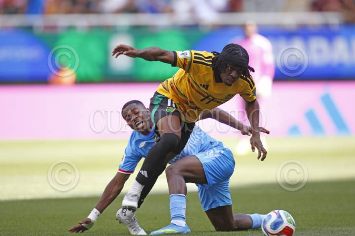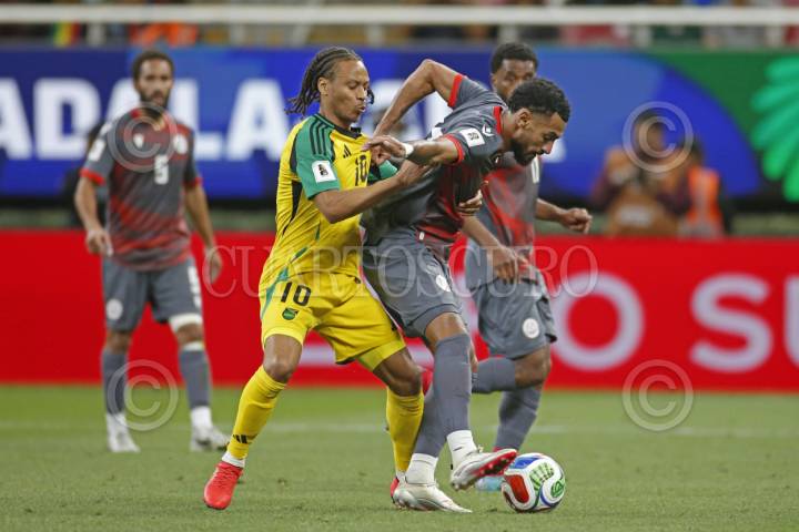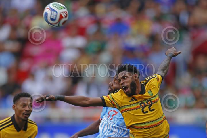 ZAPOPAN, JALISCO.. 26MARZO2025.- Bailey Cadamaterteri jugador de Jamaica disputa un balón con el contrario de Nueva Caledonia Fonzy Ranchain, esto en juego correspondiente al repechaje intercontinental entre las selecciones de Jamaica frente a Nueva Caledonia, para aspirar a un boleto mundialista Canadá; México y Estados Unidos 2026, dicho compromiso se lleva a cabo en el Estadio Guadalajara, el marcador al momento es de 1-0 a favor del equipo de Jamaica. FOTO: FERNANDO CARRANZA GARCIA / CUARTOSCURO.COM