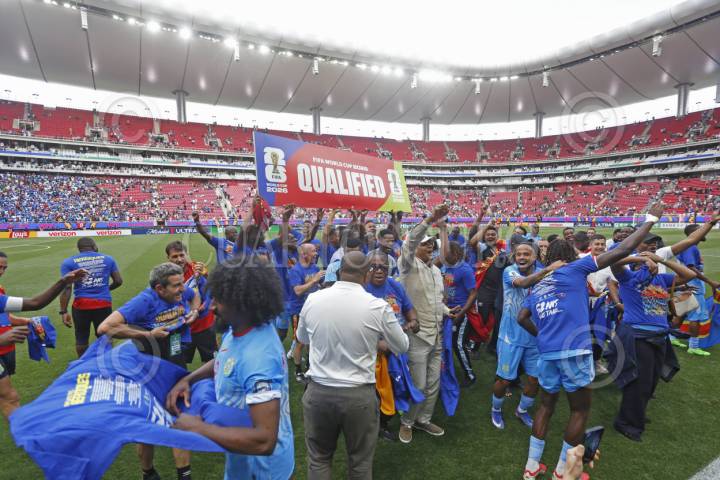 ZAPOPAN, JALISCO.. 31MARZO2025.- Jugadores y cuerpo técnico de la Selección de la republica Democrática del Congo celebran la victoria y su pase al mundial Canadá; México y Estados Unidos 2026, esto en juego correspondiente al repechaje intercontinental entre las selecciones de Jamaica frente a la Republica Democrática del Congo, dicho compromiso se llevo a cabo en el Estadio Guadalajara y el marcador al final fue de 1-0 en tiempos extras. FOTO: FERNANDO CARRANZA GARCIA / CUARTOSCURO.COM