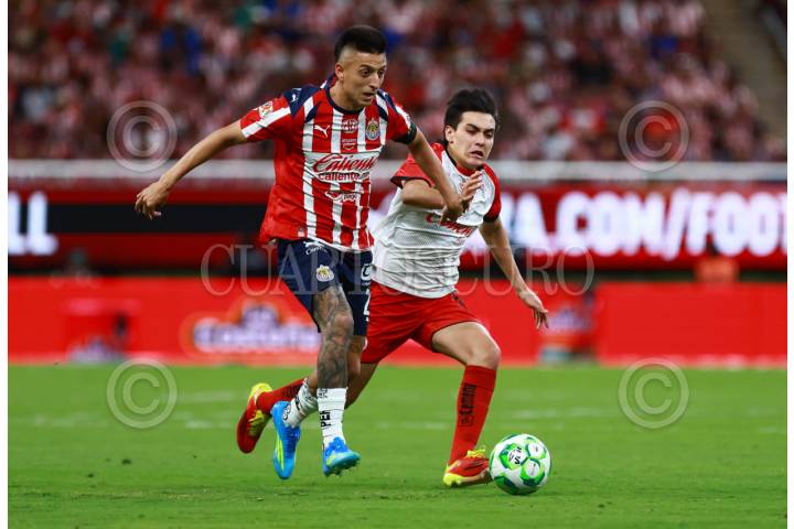 ZAPOPAN, JALISCO, 18ABRIL2026.- José Castillo jugador de Chivas disputa el balón con el contrario de Puebla Owen González, esto en partido correspondiente a la jornada 15 del Torneo Clausura 2026 de la Liga MX, en donde se enfrentan los equipos de Chivas vs Puebla y en juego que se lleva a cabo en el Estadio Akron, el marcador al momento es de 3-0, a favor del equipo de casa. FOTO: FERNANDO CARRANZA GARCIA / CUARTOSCURO.COM