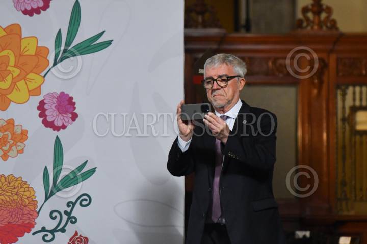 CIUDAD DE MÉXICO, 19NOVIEMBRE2025.- Mateo Valero Cortés, director del Barcelona Supercomputing Centre (BSC), toma una fotografía durante su llegada a la conferencia matutina realizada en Palacio Nacional en la que se anunció la colaboración entre el Centro Mexicano de Supercómputo y el Centro de Supercómputo de Barcelona para la creación de una súper computadora mexicana a partir de enero de 2026. FOTO: MARIO JASSO/CUARTOSCURO.COM