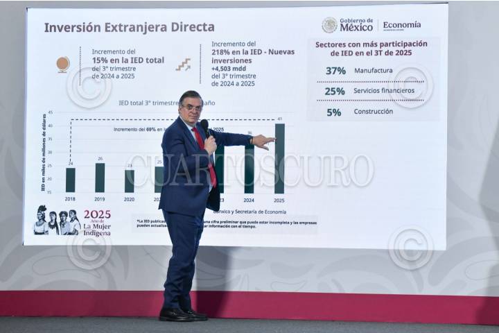 CIUDAD DE MÉXICO, 19NOVIEMBRE2025.- Marcelo Ebrard, secretario de Economía, durante su intervención en la conferencia matutina realizada en Palacio Nacional en la que anunció un incremento del 15% en la Inversión Extranjera Directa (IED) del tercer trimestre de 2024 a 2025. FOTO: MARIO JASSO/CUARTOSCURO.COM