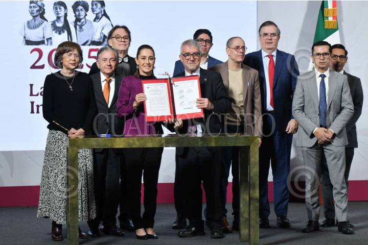 CIUDAD DE MÉXICO, 19NOVIEMBRE2025.- Claudia Sheinbaum, presidenta de México, y Mateo Valero Cortés, director del Barcelona Supercomputing Centre (BSC), durante la conferencia matutina realizada en Palacio Nacional en la que firmaron el convenio de colaboración entre el Centro Mexicano de Supercómputo y el Centro de Supercómputo de Barcelona para la creación de una súper computadora mexicana a partir de enero de 2026. Los acompañan: Rosaura Ruiz Gutiérrez, secretaria de Ciencia, Humanidades, Tecnología e Innovación; Luis Antonio Salazar Olivo, director general del Instituto Potosino de Investigación Científica; Ulises Cortés, director del Área de Investigación en Inteligencia Artificial en el Barcelona Supercomputing Centre (BSC); Raúl Soto García, director ejecutivo interino del Centro de Investigación e Innovación en Tecnologías de la Información y Comunicación (INFOTEC); José Antonio Peña Merino, titular de la Agencia de Transformación Digital y Telecomunicaciones; Marcelo Ebrard, secretario de Economía; Jorge Luis Pérez Hernández, coordinador nacional de Infraestructura Digital, y Miguel Ángel Elorza Vázquez, coordinador de Infodemia. FOTO: MARIO JASSO/CUARTOSCURO.COM
