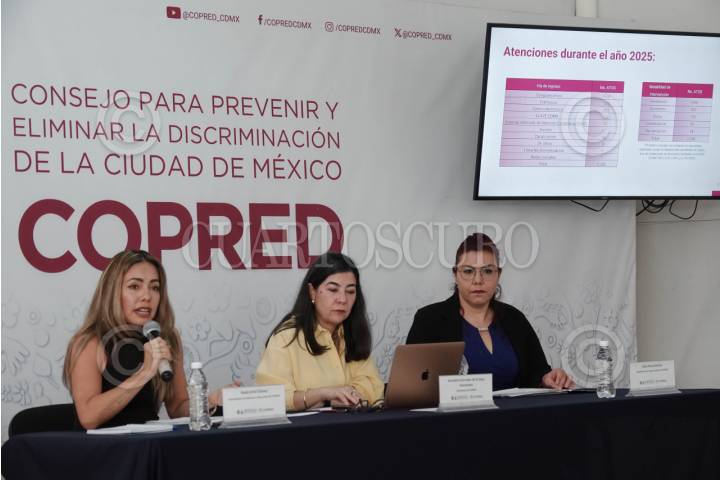 CIUDAD DE MÉXICO, 09ABRIL2026.- Conferencia de prensa del Consejo para Prevenir y Eliminar la Discriminación de la Ciudad de México (COPRED), en el que se presentó el Informe de Casos de Atención Ciudadana 2025. La presidenta del COPRED, Geraldina González de la Vega Hernández; la coordinadora de Atención y Educación del COPRED, Paola Ortiz Chávez; y la subdirectora de Apoyo Jurídico del COPRED, Sofía Pérez Sánchez, dieron a conocer los casos registrados, las áreas con mayor incidencia de discriminación y los procesos de atención. También presentaron dos cuadernos de sistematización de criterios jurisdiccionales (2019-2024) y una plataforma de registro de casos diseñada para fortalecer la toma de decisiones y la construcción de estándares institucionales. FOTO: CAMILA AYALA BENABIB / CUARTOSCURO.COM