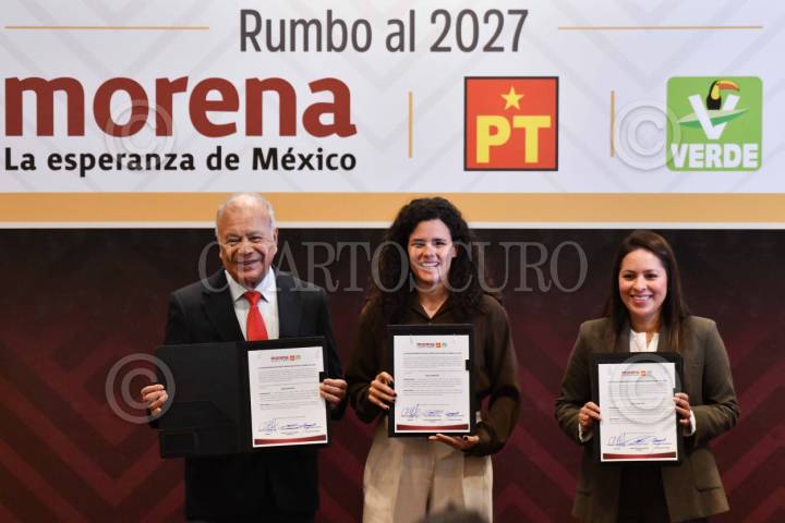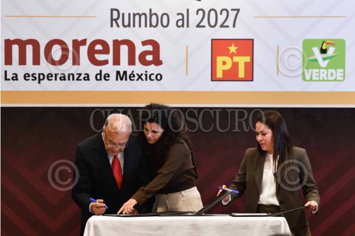 CIUDAD DE MÉXICO, 28ENERO2026.- Luisa María Alcalde, dirigente nacional de Morena; Karen Castrejón, dirigente del PVEM, y Alberto Anaya, dirigente del PT, en conferencia en la que reafirmaron la alianza política entre dichos partidos y firmaron la declaratoria "La transformación más fuerte que nunca" rumbo al 2027. FOTO: MARIO JASSO/CUARTOSCURO.COM