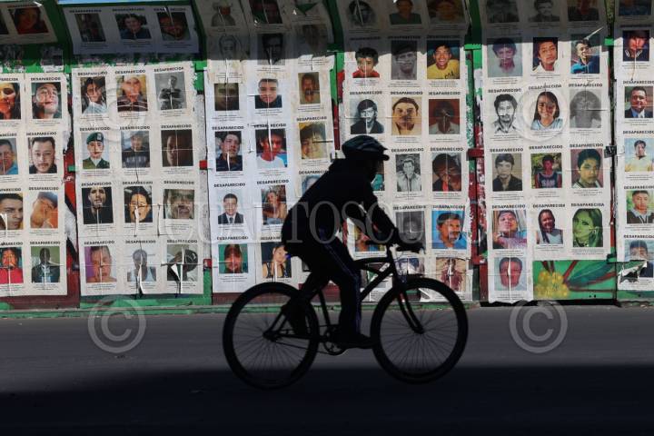 CIUDAD DE MÉXICO, 16NOVIEMBRE2025.- Rostros de personas desaparecidas se observan pegadas en la Glorieta de las y los Desaparecidos, mientras el Paseo Ciclista continúa con cotidianidad. FOTO: MOISÉS PABLO/CUARTOSCURO.COM