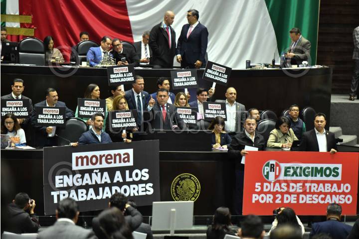 CIUDAD DE MÉXICO, 24FEBRERO2026.- Alejandro Domínguez, diputado del PRI, junto a sus compañeros de bancada exigieron los dos días de descanso obligatorios, durante la sesión ordinaria de la Cámara de Diputados en la que se discute el dictamen en materia de reducción de la jornada laboral a 40 horas. FOTO: MARIO JASSO/CUARTOSCURO.COM