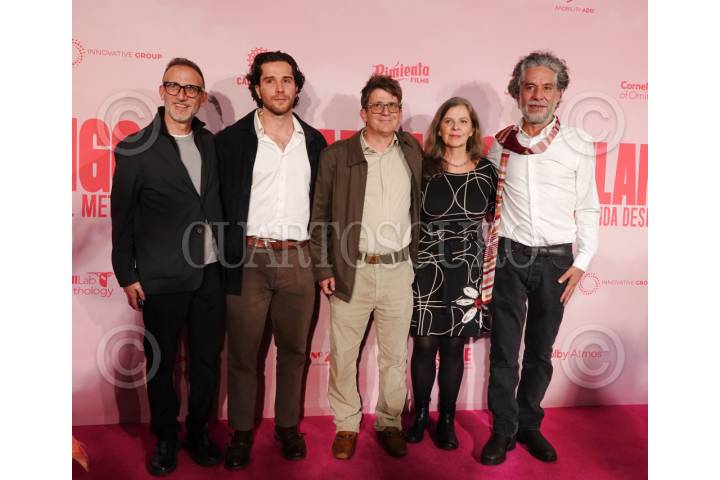 CIUDAD DE MÉXICO, 18MARZO2026.- El director Lorenzo Hagerman; el productor José Cohen; su hermano Moisés Cohen; Lucas Hagerman; y Nicole Soriano, a su paso por la alfombra rosa del documental “Flamingos: La vida después del meteorito”. FOTO: CAMILA AYALA BENABIB / CUARTOSCURO.COM