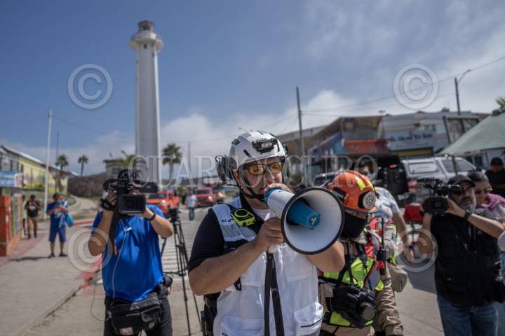 TIJUANA BAJA CALIFORNIA 19SEPTIEMBRE2025.-Por primera vez se realizó un simulacro de tsunami en Playas de Tijuana, con la participación de 100 personas, así como elementos de Bomberos y Protección Civil Municipal. El ejercicio incluyó el cierre de vialidades desde el Faro y simuló un tsunami de magnitud 9.5 con epicentro en Hawái, lo que daría un margen de 30 minutos para evacuar. Personal de Protección Civil brindó información preventiva a los asistentes, en el marco de la conmemoración por los 40 años del sismo de 1985. FOTO OMAR MARTÍNEZ / CUARTOSCURO.COM