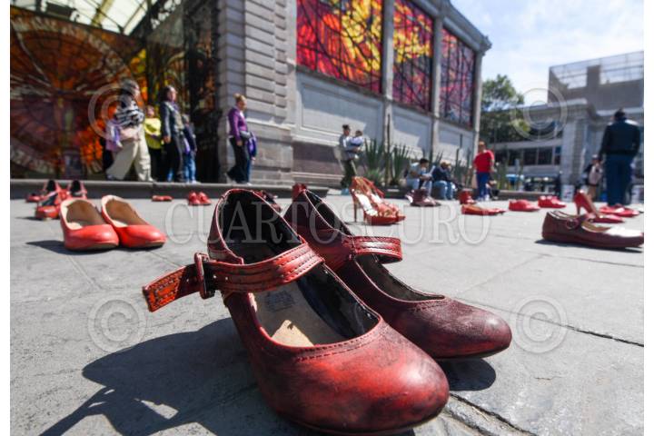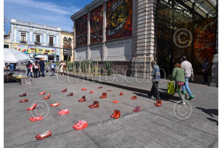 TOLUCA, ESTADO DE MÉXICO, 25NOVIEMBRE2025.- En el marco del Día Internacional de la Eliminación de la Violencia contra la Mujer integrantes del colectivo Xinula y el Taller Gráfica Tinta Negra colocaron frente al Jardín Botánico Cosmovitral la obra Zapatos Rojos, obra de Elina Chauvet, en esta ocasión sólo fueron colocados 25 zapatos, representando cada uno un feminicidio, de manera simultánea y durante una hora se instalaron zapatos rojos en 25 ciudades alrededor del mundo. FOTO: CRISANTA ESPINOSA AGUILAR /CUARTOSCURO.COM