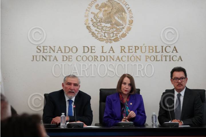 CIUDAD DE MÉXICO, 15OCTUBRE2025.- Adán Augusto López, coordinador de Morena y presidente de la JUCOPO, Laura Itzel Castillo, secretario de Economía, e Ignacio Mier, vicecoordinador de Morena, encabezaron la conferencia de prensa en la que se dieron detalles sobre la extinción del fideicomiso creado hace 31 años para la construcción y equipamiento de su sede de Reforma e Insurgentes, con lo que se devuelve mil 50 millones de pesos a la Federación. FOTO: GALO CAÑAS/CUARTOSCURO.COM