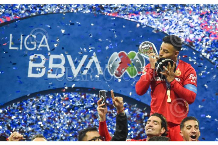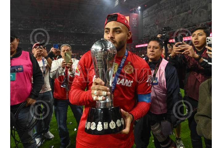 TOLUCA, ESTADO DE MÉXICO, 14DICIEMBRE2025.- Los Diablos de Toluca se corona como Campeón del Torneo Apertura 2025 de la Liga MX al derrotar a la escuadra de Tigres en el estadio Nemesio Diez, partido definido en penales con un marcador 9-8 a favor de la escuadra escarlata. En la imagen, el capitán Alexis Vega carga el trofeo. FOTO: CRISANTA ESPINOSA AGUILAR/CUARTOSCURO.COM