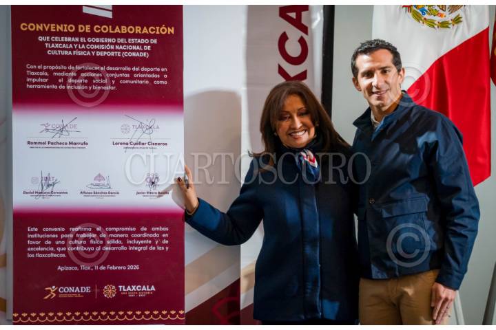 APIZACO, TLAXCALA, 11FEBRERO2026.- Lorena Cuéllar Cisneros, gobernadora de Tlaxcala; y Rommel Pacheco, director de la CONADE, presentaron el calendario de eventos de talla mundial. Este despliegue de actividades no solo traerá a los mejores atletas del planeta, sino que proyecta una derrama económica superior a los 200 millones de pesos. El año deportivo abrirá fuerte del 18 al 22 de marzo con el regreso del Tour Mundial de Voleibol de Playa, celebrando su cuarta edición en territorio tlaxcalteca con 192 atletas internacionales. La emoción futbolera llegará con el Fan Fest del Mundial (11 de junio - 19 de julio), seguido por el Grand Prix de Para atletismo (16 - 25 de julio), que reunirá a más de 500 para atletas de 12 países buscando su clasificación a Los Ángeles 2028. FOTO: ALAÍN HERNÁNDEZ/CUARTOSCURO.COM