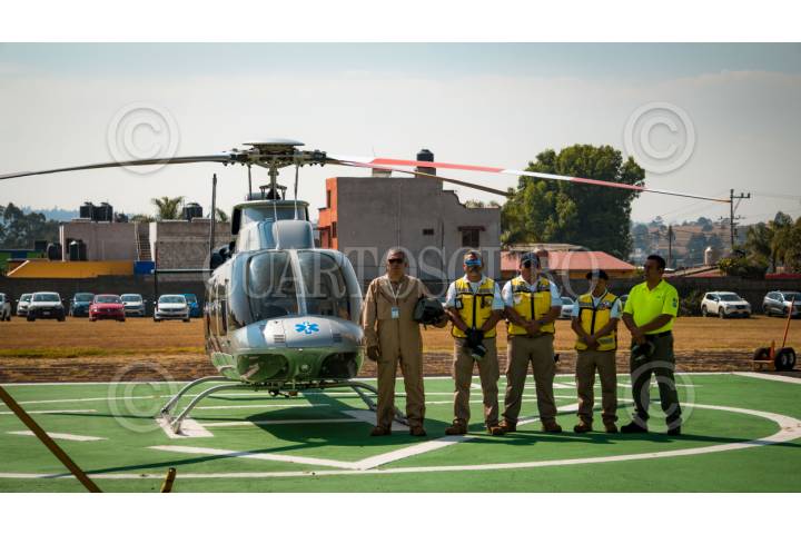 TOLUCA, ESTADO DE MÉXICO, 18 DE FEBRERO DE 2026.- Un helicóptero del Grupo Relámpagos estuvo presente este miércoles en el Primer Simulacro 2026, en el que el Estado de México y la Ciudad de México tomaron parte. A las 11 de la mañana sonó la alerta sísmica en ambas entidades, simulando un sismo de magnitud 7.2 con epicentro en Pinotepa Nacional, Oaxaca. Durante el simulacro, se evacuaron los edificios de la zona centro que albergan oficinas gubernamentales. FOTO: CRISANTA ESPINOSA AGUILAR/CUARTOSCURO.COM